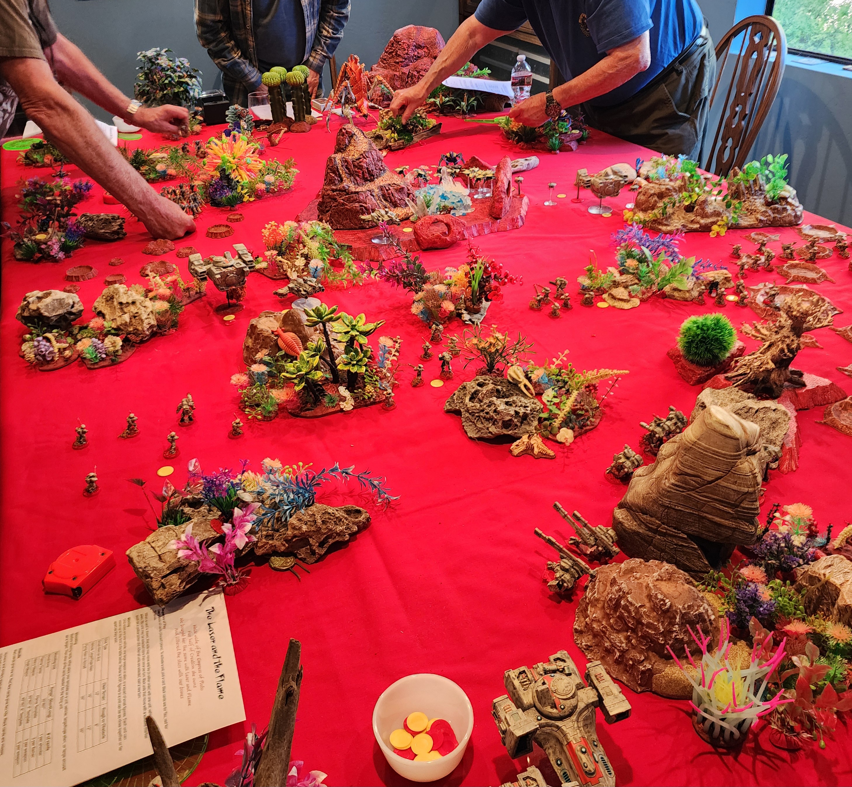There were six of us and for some odd reason I was made the Commander of the “Not-Tau” against the “Not-Tyranids” on a planet full of resources and terrain built cunningly from aquarium pieces. ***