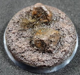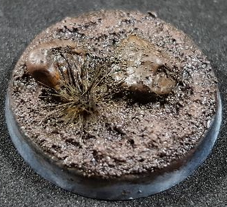 - Glued a couple of rocks and an Army Painter tuft onto an old, unprimed base, then applied Vallejo Dark Earth Texture (26.218). I watered a bit of the texture down and used it as a wash on the rocks too. I used some texture wash on the plant as well.